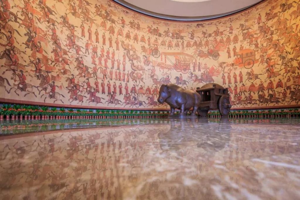 進入大同博物館后,首先引起您注意的是大型壁畫-北魏的旅游地圖。高約15.5米,寬約50米。內容是根據大同市沙嶺村北魏壁畫墓的“旅游地圖”,繪制的北魏貴族旅游場景。